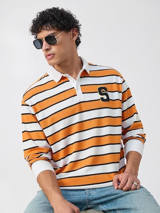 Men’s Long Sleeves Collared Neck Striped T-Shirts, White/Orange